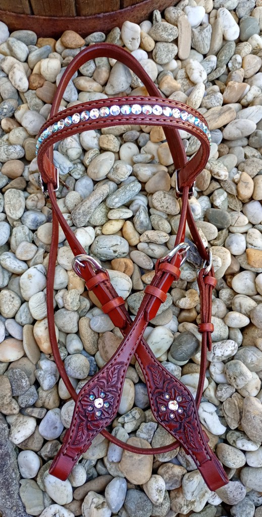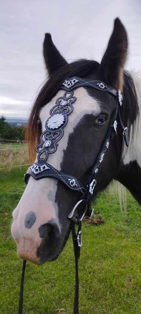 Uzda zdobená klepaným vzorom kvetov, doplnené kamienkami Preciosa.